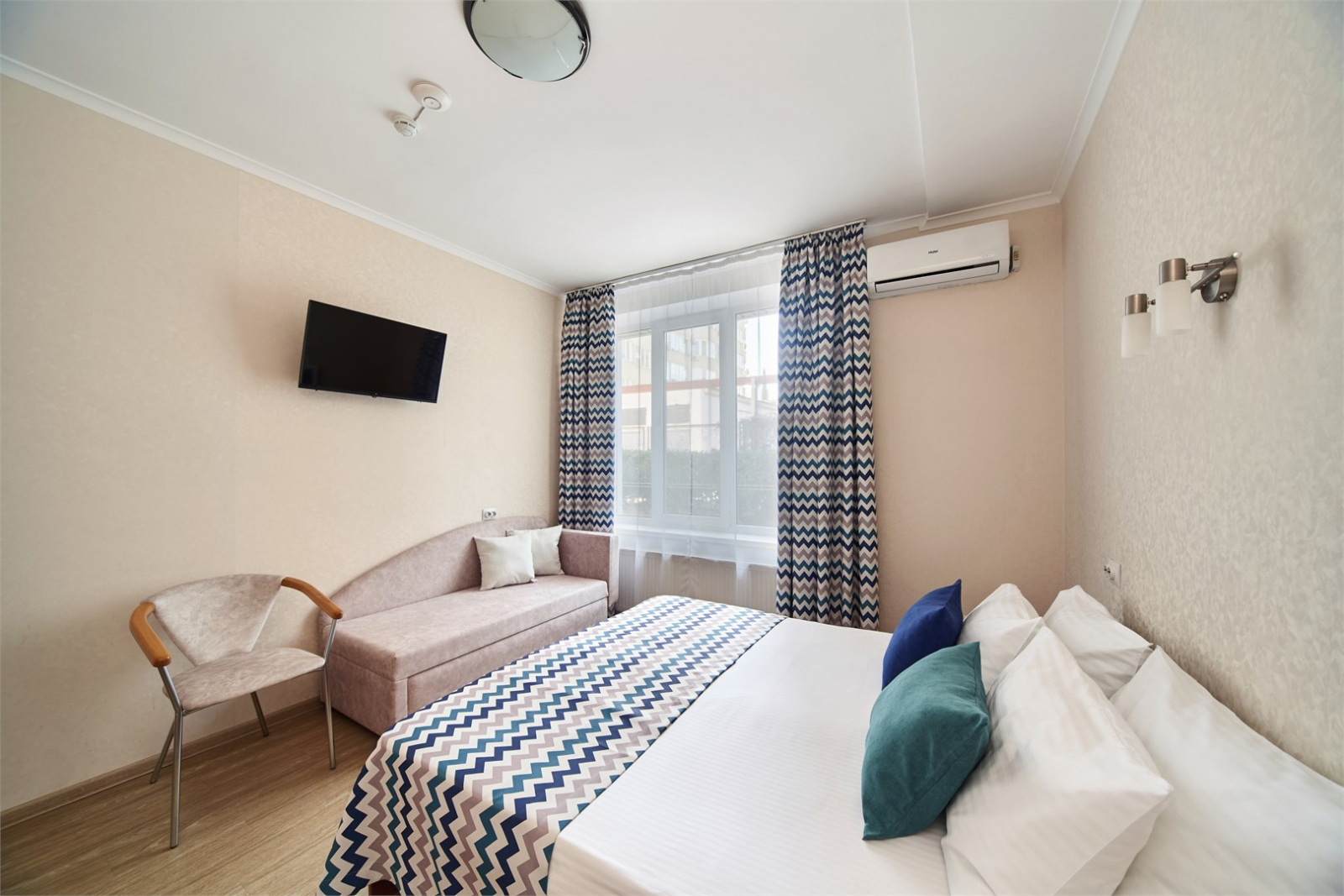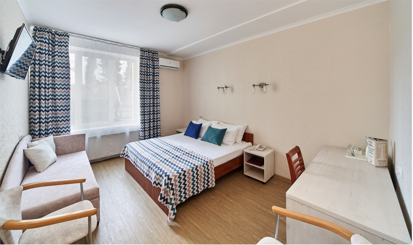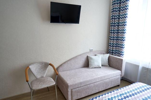 Комфортабельный большой номер рассчитан на размещение одного человека, идеально подходит как для отдыха, так и для работы и командировочных поездок. Площадь номера 22 кв. м. В номере для Вас двуспальная кровать размером 1800х2000 м, телевизор, внутренний телефон, холодильник, кондиционер (в холодное время автономное отопление), мини-сейф. электрический чайник, посуда, питьевая вода, чайная станция с набором чаев. Для Вашего удобства ванная комната оборудована душевой кабинкой, феном, банными принадлежностями, тапочками, средствами гигиены (мыло, гель, шампунь), халатом. Вид из номера во внутренний двор гостиницы или на море. ДОПОЛНИТЕЛЬНЫЕ МЕСТА Дети в возрасте от 0 до 3 лет (включительно) проживание и детская кроватка предоставляются БЕСПЛАТНО (без питания) Дети в возрасте от 3 до 14 лет (включительно) дополнительное место (диван) 500 руб. (без питания) Дети в возрасте от 0 до 14 лет (включительно) без предоставления места (проживание на одной кровати вместе со взрослым) БЕСПЛАТНО (без питания)