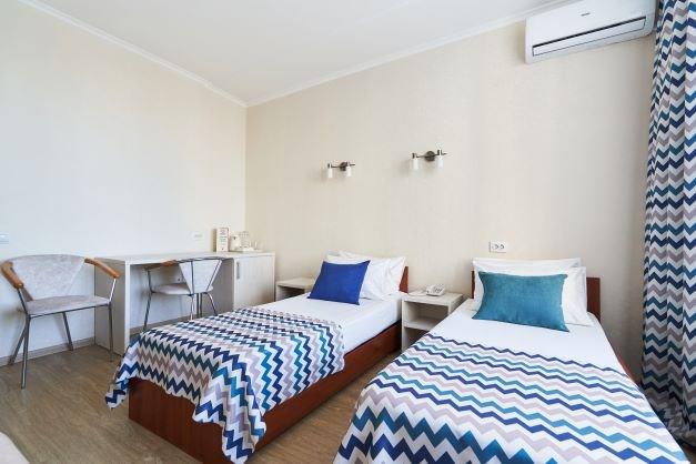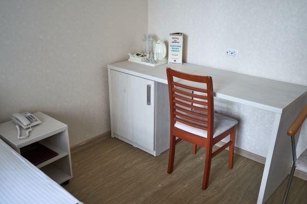 Комфортный 2-местный номер улучшенной комплектации, рассчитан на размещение двух человек, подходит для отдыха или работы в деловых поездках. Вид из номера во внутренний двор гостиницы. Площадь номера 22 кв. м. В номере возможно дополнительное место (диван) Оснащение номера Мебель: двуспальная кровать или две раздельные односпальные кровати, две прикроватные тумбы, шкаф со встроенным сейфом, зеркало, письменный стол, стул, кресло, диван Техника: телевизор с плоским экраном (кабельное ТВ), мини-холодильник, внутренний телефон, кондиционер, электрочайник, фен Ванная комната: душевая кабинка, зеркало, вешалка, банные принадлежности, гигиенические средства (мыло, гель, шампунь) Дополнительно в номере: халат, чайная посуда и чайный набор, питьевая вода, пакет для прачечной, щетка для одежды, ложка для обуви, щетка для обуви, вешалки для одежды, информационные материалы, тапочки